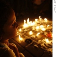 | A girl pays tribute as people light candles to pay respectS to those who were killed in terror attacks in Mumbai, India, 30 Nov 2008 |