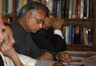 | Indian Home Minister Shivraj Patil, left, and Indian Foreign Minister Pranab Mukherjee, right, look on during a Congress Working Committee meeting on the Mumbai terrorist attack, in New Delhi, 29 Nov 2008 |