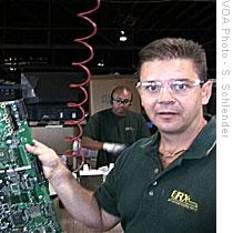 | John Miller18 holds a circuit board that was removed from a discarded computer. Gold, silver and palladium can be recovered from it |