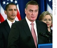 | President-elect Barack Obama (L)and Hillary Clinton (R) listen as nominee13 for national security adviser14, retired15 Marine16 Gen. James L. Jones speaks during Chicago press conference, 01 Dec 2008 |