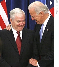 | Vice5 President-elect Joe Biden (r)congratulates Defense Secretary Robert Gates in Chicago, 01 Dec 2008 |