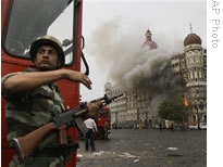 | An Indian soldier takes cover as the Taj Mahal hotel burns during gun battle between Indian military and militants4 inside the hotel in Mumbai |