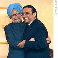 | Indian PM Manmohan Singh (l) hugs Pakistan's President Asif Ali Zardari during a meeting in New York on the sidelines of the United Nations General Assembly meeting, 24 Sep 2008 |