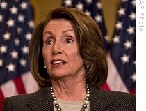 | Speaker of the House Nancy Pelosi speaks with reporters on Capitol Hill about the crisis in the American auto industry, 2 Dec. 2008 |