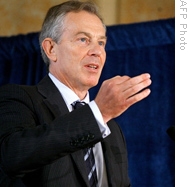 Mr. Blair says the Palestinian Authority in the West Bank must prove it can maintain security. He says Israel must also stop building Jewish settlements there.