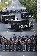| Thai police man a checkpoint near the Suvarnabhumi airport compound Sunday 30 Nov. 2008 in Bangkok Thailand |