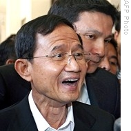 | Somchai Wongsawat, left, talks to reporters after court dissolves ruling party and bans him from politics, in Chiang Mai, 02 Dec 2008 |