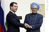 | Russian Pres. Medvedev (L), and Indian Prime Minister Singh shake hands in New Delhi, 05 Dec 2008 |