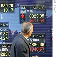 | A man walks past an electronic stock indicator4 in Tokyo, Japan, 08 Dec 2008 |