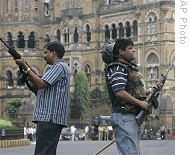 | Members of anti-terrorist squad6 take positions outside Chhatrapati Shivaji railroad station following rumor7 of terrorist attack in Mumbai, India, 28 Nov 2008 |