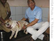 | Sheru, a dog wounded by a stray bullet at Mumbai's main railway station, is attended by Dr. J.C. Khanna, head veterinarian at central Mumbia’s charity animal hospital |