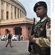 | Security person stands guard outside Indian parliament in New Delhi, 10 Dec 2008 |