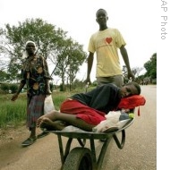 | A woman suspected to be suffering from cholera, is transported in a wheelbarrow to a clinic for treatment, in Harare, 11 Dec 2008 |