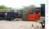 | A house in Hobyo, Somalia likely used by pirates with 4-wheel drive vehicles parked outside, 22 Dec 2008 |