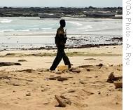 | A pirate taking a stroll on shore in Hobyo, Somalia, 22 Dec 2008 |