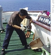 | Photo released by China's Xinhua News Agency shows Chinese crew member igniting fire bomb to defend against pirate attack in Gulf6 of Aden, 17 Dec 2008 |