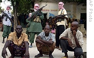 | Al-Shabaab fighters guard three men accused of selling cannabis in Qoryoley, Somalia, 13 Dec 2008 |