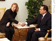 | Egyptian President Hosni Mubarak, right, greets Israeli Foreign Minister Tzipi Livni during meeting at Presidential Palace in Cairo, 25 Dec 2008 |