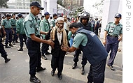 | Police officers frisk a man who arrives to attend a rally addressed by Sheikh Hasina in Dhaka, 26 Dec 2008 |