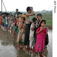 | Cyclone-affected children lined up in the rain waiting for food in the Shwepoukkan area of Burma, 25 May 2008 |