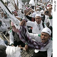 | Members of Islamic Defenders4 Front shout "God is great" during a protest at the National Monument in Jakarta, Indonesia, 01 June 2008 2008 |