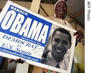 | Grandmother of Barrack Obama, Sarah Obama Onyango, holds a Senate election placard promoting Obama at her home in western Kenya, 04 Feb 2008 |