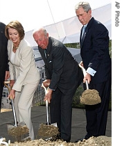 | President Bush, former Secretary of State George Shultz, center, and House Speaker Nancy Pelosi take part in a ceremonial groundbreaking of the United States Institute of Peace, 5 Jun 2008 |