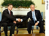 "We also talked about the European Union," said Prime Minister Balkenende. "And I am convinced that the United States and the European Union share the same values. We talked about it: freedom, human rights and democracy, economic dynamism, sustainable development. And I think that if we work together, we can really make a difference. And I think it is necessary."
