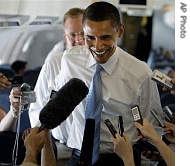 | Democratic presidential candidate Senator Barack Obama speaks to the media while in flight 5 June 2008 |
