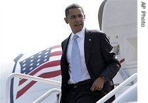 | Democratic presidential candidate Sen. Barack Obama steps off the plane at the airport in Mountville, Tennessee, 05 June 2008 |