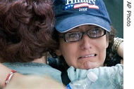 | Bonnie Bon Jiorno, right, hugs a fellow supporter Clinton after Hillary Clinton announced suspension of her presidential campaign, 7 June 2008 |