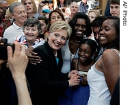 | Hillary Rodham Clinton poses for a picture with supporters at the National Building Museum in Washington after she suspended her campaign for president, 7 June 2008 |