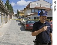 | A Kosovan police officer stands guard in front of the sealed road leading to the residence of Prime Minister Hashim Thaci in Pristina, 07 Jun 2008 |