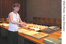 "It really helped me to learn from my professors, from librarians, for example, how to unroll and roll a hanging scroll1, how to flip4 over pages, how to cover my breath when I look at these thousands-year-old books and paintings and stuff," Kim says.