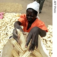 | Zimbabwean woman puts maize1 into bag in Domboshawa, 23 Apr 2008 |