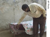 | Abdullahi Guled covers the body of his wife Fadumo Awil, after a mortar5 shell slammed into their house and killed her instantly in Mogadishu, 8 June 2008 |