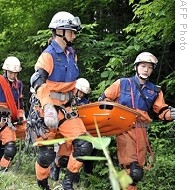 | Rescue workers holding stretchers to carry injured and elderly persons walk towards villages isolated1 by a landslide2 after earthquake |