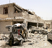 | An Afghan policeman stands among shattered buildings and vehicles at the site of a suicide attack in front of the entrance to the main jail in Kandahar on 14 June 2008 |