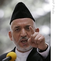 | Afghan President Hamid Karzai gestures during a press conference at the presidential palace in Kabul, Afghanistan, Sunday, 15 June 2008 |