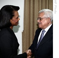 | Palestinian President Mahmoud Abbas, right, meets US Secretary of State Condoleezza Rice in the West Bank city of Ramallah, 15 Jun 2008 |