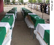 | Pakistani officials and others offer funeral prayers to paramilitary troops who lost their lives during a clash at the Pakistan-Afghanistan border, 11 Jun 2008 (photo released by Pakistan's Press Information Department) |