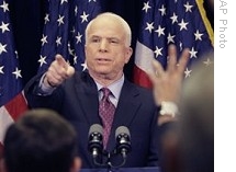 | Sen. John McCain points to a reporter during a press briefing at his campaign headquarters in Arlington, Virginia, 16 June 2008 |
