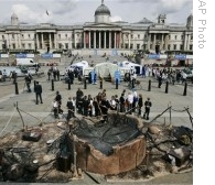 | School pupils look at a representation of a Darfur village supposedly destroyed during the war, in central London's Trafalgar Square, 17 Jun 2008 |