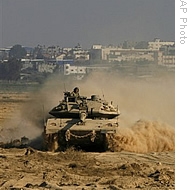 | Backdropped by the Gaza Strip, an Israeli tank drives on the Israel-Gaza border, 19 Jun 2008 |