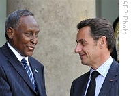| French President Nicolas Sarkozy (R) welcomes his Somali counterpart Abdullahi Yusuf Ahmed prior to a meeting at the Elysee palace, 5 May 2008 in Paris (file) |
