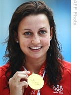 | Rebecca Soni poses2 with gold medal after ceremony for women's 200m breaststroke final, 15 Aug 2008 |