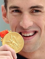| Michael Phelps holds gold medal for record-breaking swim in 200 meter individual medley final in Beijing, 15 Aug 2008 |