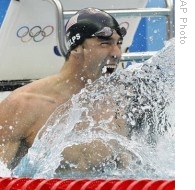 | United States' Michael Phelps reacts after winning the gold medal during the swimming competitions in the National Aquatics2 Center at the Beijing 2008 Olympics in Beijing, 16 Aug 2008 |