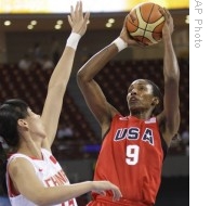 | China's Chen Nan defends USA center Lisa Leslie shoots during the first quarter of a women's preliminary basketball game at the Beijing 2008 Olympics, 11 Aug 2008 |