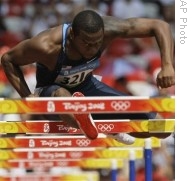 | David Oliver clears a hurdle2 in a men's 110-meter hurdles3 first round heat in Beijing, 18 Aug 2008 |
